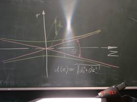 Deutlich erkennbar ist die Begrenzung des Lichtbündels in der Form eines einschaligen Hyperboloids. Dieser enthält immer einen engsten Querschnitt, die Strahltaille, auch Fokus genannt. Hier wurde also mit Hilfe optischer Komponenten aus einer Strahlquelle, der Glühwendel, ein Strahlen-bündel aus Licht geformt. Auf die gleiche Weise werden auch Strahlenbündel geformt, die ihren Ursprung in einem Laser als Strahlquelle haben – also Laserstrahlen.
