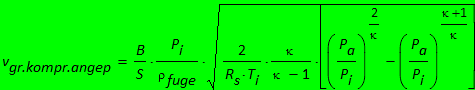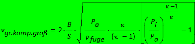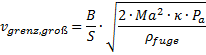 Die Machzahl ist aus Gleichung (50) bekannt, so dass sich die Grenzgeschwindigkeit für das Schneiden mit kompressiblen Schneidstrahlen großer Durchmesser unter Verwendung der üblich angegebenen Betriebsparameter in folgender Gleichung (66) dargestellt wird.